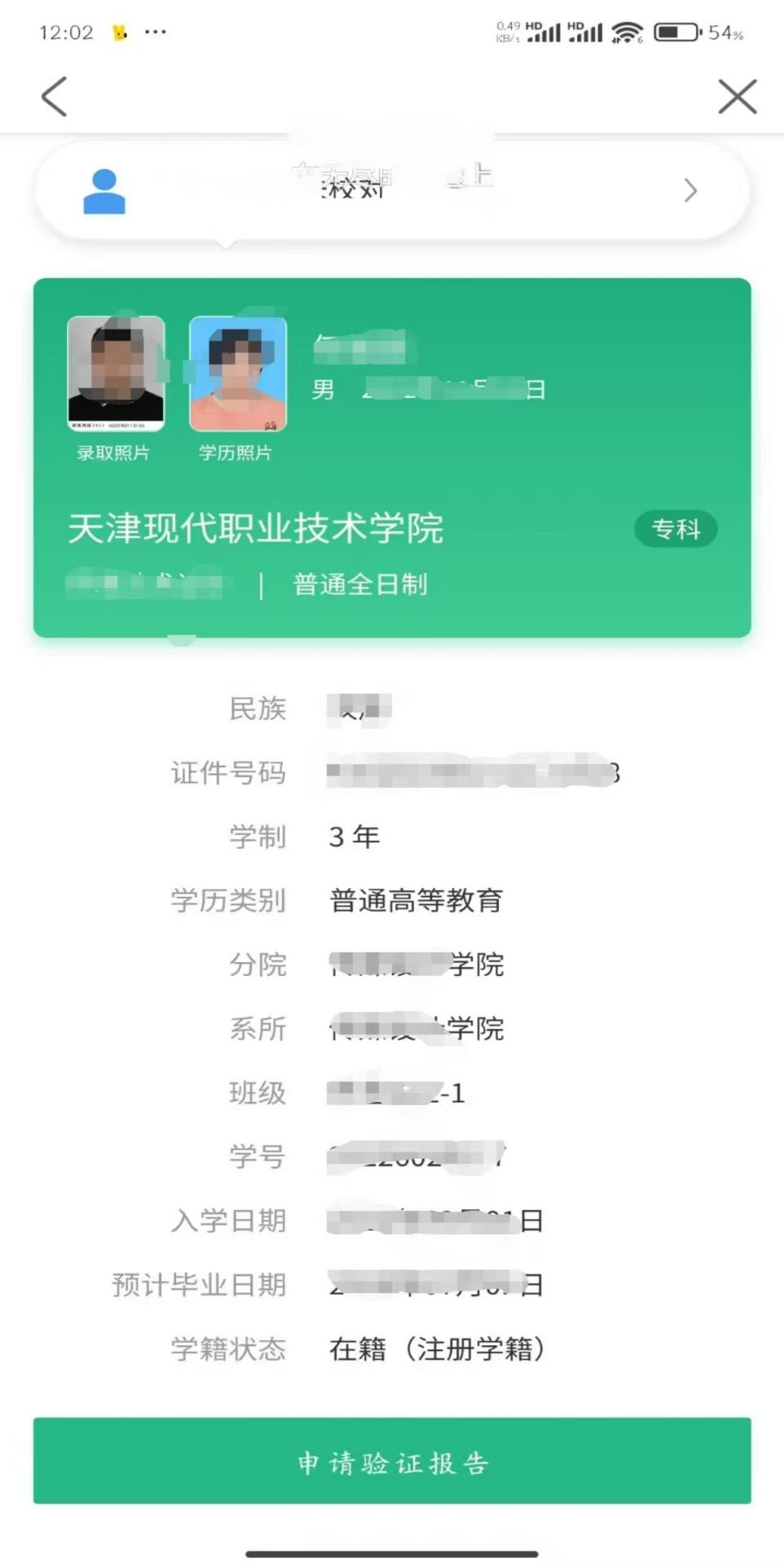 (5)学信网学籍页面截图并加盖二级学院公章,截图样例如下: