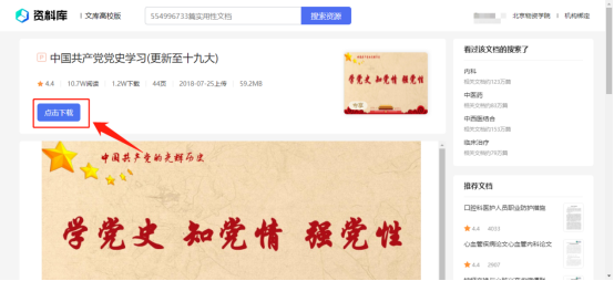 百度文库高校版下所有文档都可以实现全文浏览和直接下载,选择所需文档进入浏览,在标题下有“点击下载”按钮,点击下载。