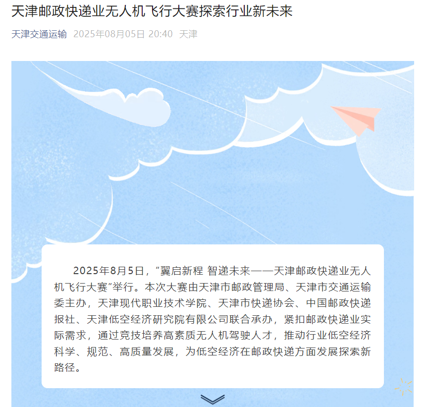 2025年8月5日,“翼启新程 智递未来——天津邮政快递业无人机飞行大赛”举行。本次大赛由天津市邮政管理局、天津市交通运输委主办,天津现代职业技术学院、天津市快递协会、中国邮政快递报社、天津低空经济研究院有限公司联合承办,紧扣邮政快递业实际需求,通过竞技培养高素质无人机驾驶人才,推动行业低空经济科学、规范、高质量发展,为低空经济在邮政快递方面发展探索新路径。