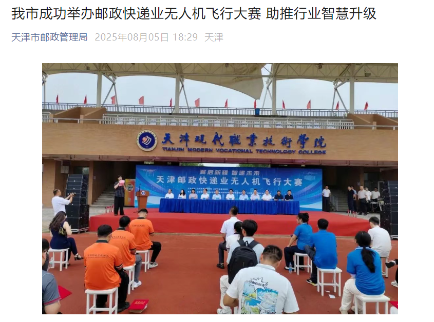 为贯彻落实《国家邮政局关于加快邮政业科技发展的意见》,推动我市邮政快递业低空经济创新应用,促进产学研融合发展,8月5日,“翼启新程 智递未来——天津邮政快递业无人机飞行大赛”成功举办,为邮政快递业低空经济高质量发展探索新路径。市邮政管理局党组书记、局长王东,市交通运输委员会总经济师、二级巡视员孙长国,市发展改革委二级巡视员朱楚雄,天津渤海轻工投资集团有限公司副总经理、天津低空经济研究院有限公司执行董事杨川,天津现代职业技术学院党委书记康宁出席活动。