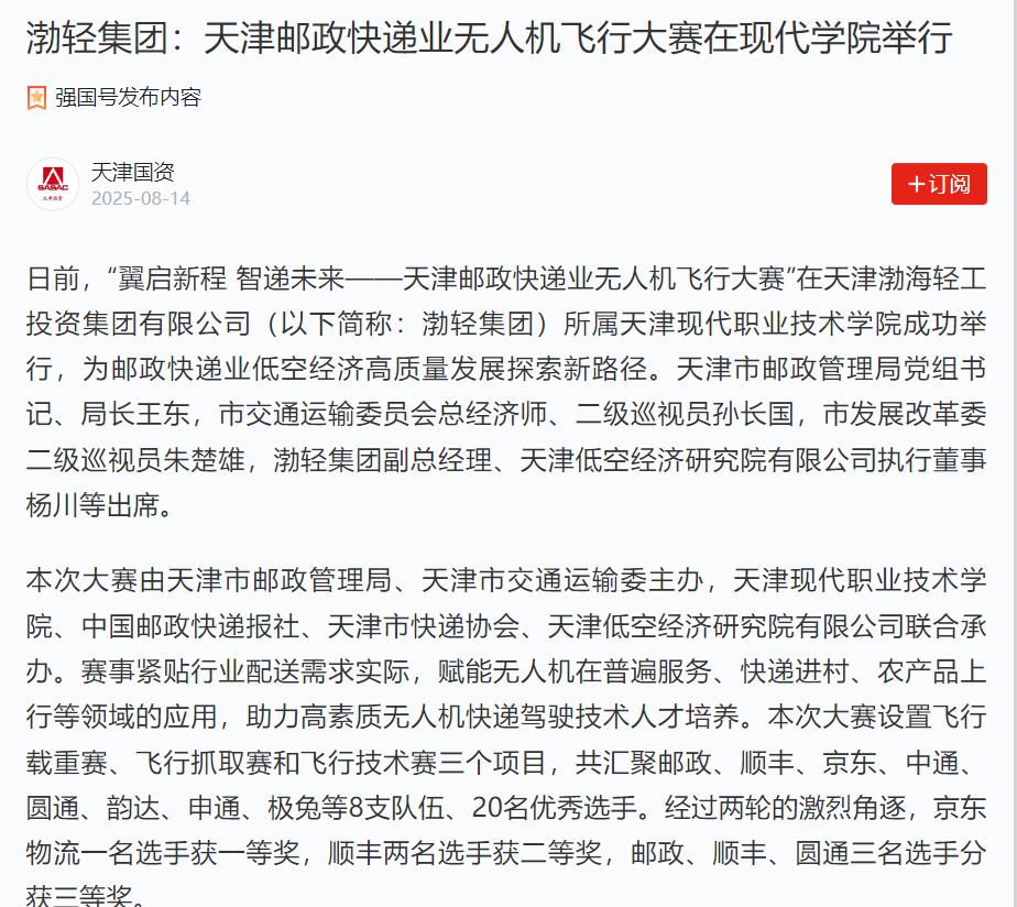 日前,“翼启新程 智递未来——天津邮政快递业无人机飞行大赛”在天津渤海轻工投资集团有限公司(以下简称:渤轻集团)所属天津现代职业技术学院成功举行,为邮政快递业低空经济高质量发展探索新路径。天津市邮政管理局党组书记、局长王东,市交通运输委员会总经济师、二级巡视员孙长国,市发展改革委二级巡视员朱楚雄,渤轻集团副总经理、天津低空经济研究院有限公司执行董事杨川等出席。