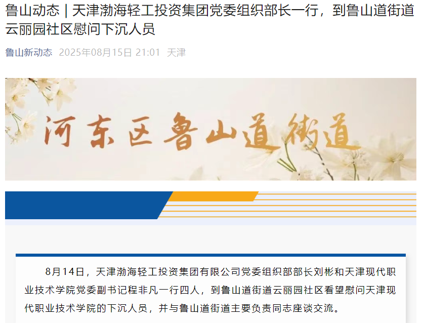 8月14日,天津渤海轻工投资集团有限公司党委组织部部长刘彬和天津现代职业技术学院党委副书记程非凡一行四人,到鲁山道街道云丽园社区看望慰问天津现代职业技术学院的下沉人员,并与鲁山道街道主要负责同志座谈交流。