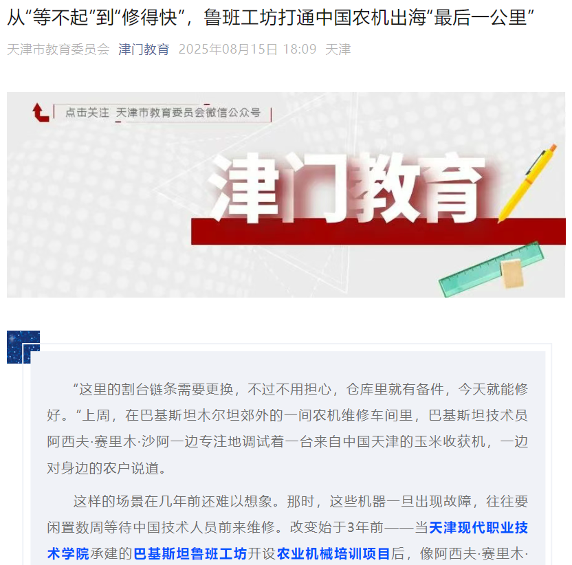 从售后困境到属地化破局,从单一出口到生态共建,天津现代职业技术学院巴基斯坦鲁班工坊农业机械培训项目,不仅让中国农机成功扎根巴基斯坦,也为中国企业“走出去”提供了可复制的经验。