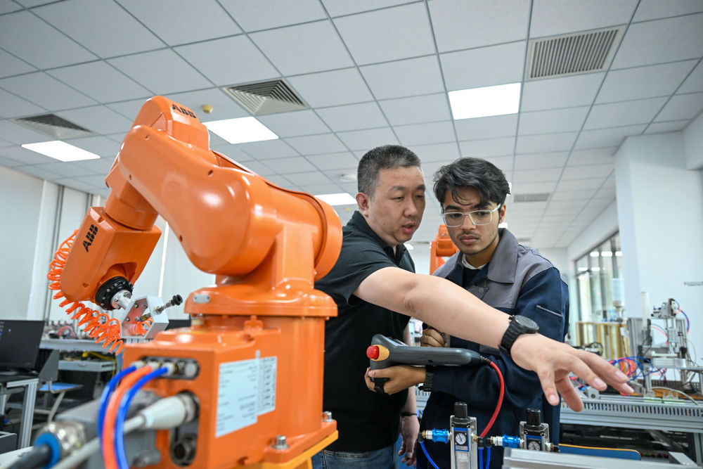 ↑ 在天津现代职业技术学院鲁班工坊实训教室,老师在课堂上教木衫(右)操作自动化设备(6月16日摄)。