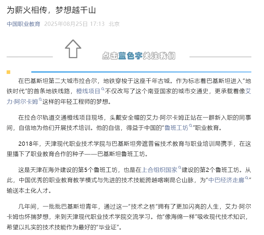这是天津在海外建设的第5个鲁班工坊,也是在上合组织国家建设的第2个鲁班工坊。从此,中国优秀的职业教育教学模式与先进的技术技能跨越喀喇昆仑山脉,为“中巴经济走廊”输送本土化人才。
