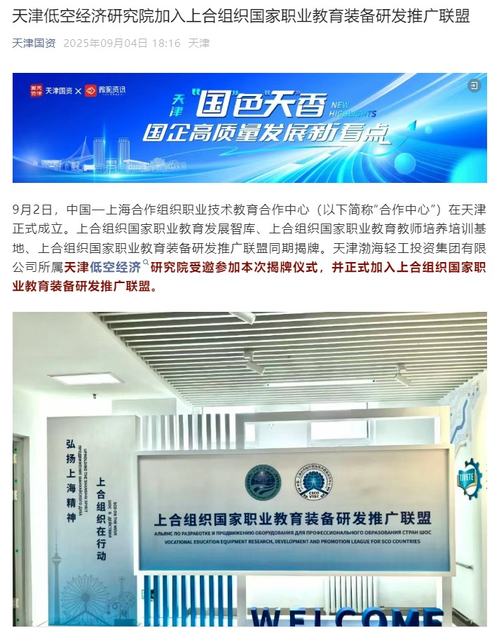 9月2日,中国—上海合作组织职业技术教育合作中心(以下简称“合作中心”)在天津正式成立。上合组织国家职业教育发展智库、上合组织国家职业教育教师培养培训基地、上合组织国家职业教育装备研发推广联盟同期揭牌。天津渤海轻工投资集团有限公司所属天津低空经济研究院受邀参加本次揭牌仪式,并正式加入上合组织国家职业教育装备研发推广联盟。