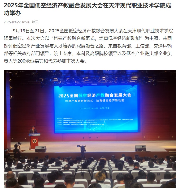 9月19日至21日,2025全国低空经济产教融合发展大会在天津现代职业技术学院隆重举行。本次大会以“构建产教融合新范式,培育低空经济新动能”为主题,共同探讨低空经济产业发展与人才培养的深度融合之路。来自教育部、工信部、交通运输部等相关政府部门领导,院士专家,本科及高职院校领导以及低空产业链头部企业负责人等200余位嘉宾和代表参加本次大会。