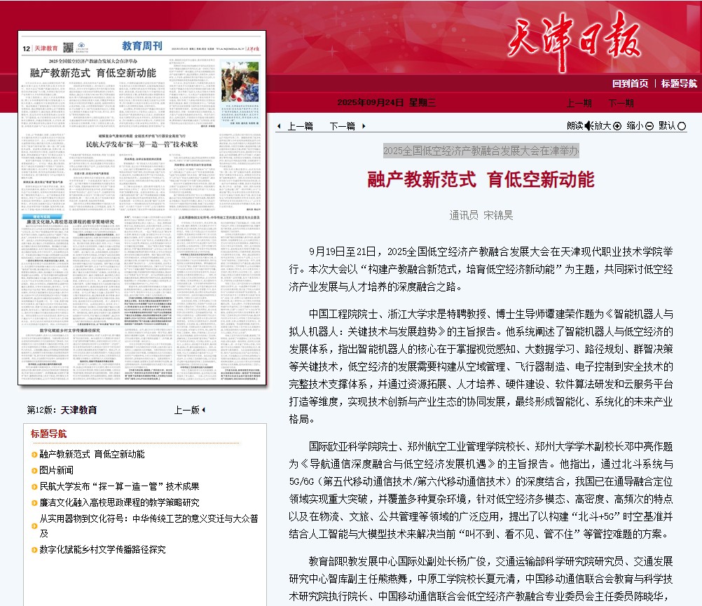 9月19日至21日,2025全国低空经济产教融合发展大会在天津现代职业技术学院举行。本次大会以“构建产教融合新范式,培育低空经济新动能”为主题,共同探讨低空经济产业发展与人才培养的深度融合之路。