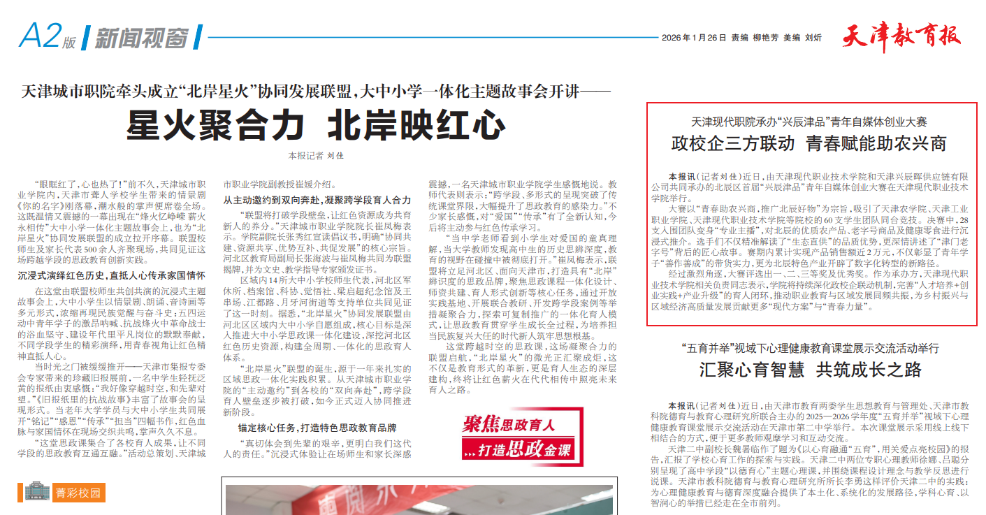 本报讯(记者刘佳)近日,由天津现代职业技术学院和天津兴辰晖供应链有限 公司共同承办的北辰区首届“兴辰津品”青年自媒体创业大赛在天津现代职业技术 学院举行。 大赛以“青春助农兴商,推广北辰好物”为宗旨,吸引了天津农学院、天津工业 职业学院、天津现代职业技术学院等院校的 60 支学生团队同台竞技。决赛中,28 支入围团队变身“专业主播”,对北辰的优质农产品、老字号商品及健康零食进行沉 浸式推介。选手们不仅精准解读了“生态直供”的品质优势,更深情讲述了“津门老 字号”背后的匠心故事。赛期内累计实现产品销售额近 2 万元,不仅彰显了青年学 子“善作善成”的带货实力,更为北辰特色产业开辟了数字化转型的新路径。 经过激烈角逐,大赛评选出一、二、三等奖及优秀奖。作为承办方,天津现代职 业技术学院相关负责同志表示,学院将持续深化政校企联动机制,完善“人才培养+创 业实践+产业升级”的育人闭环,推动职业教育与区域发展同频共振,为乡村振兴与 区域经济高质量发展贡献更多“现代方案”与“青春力量”。