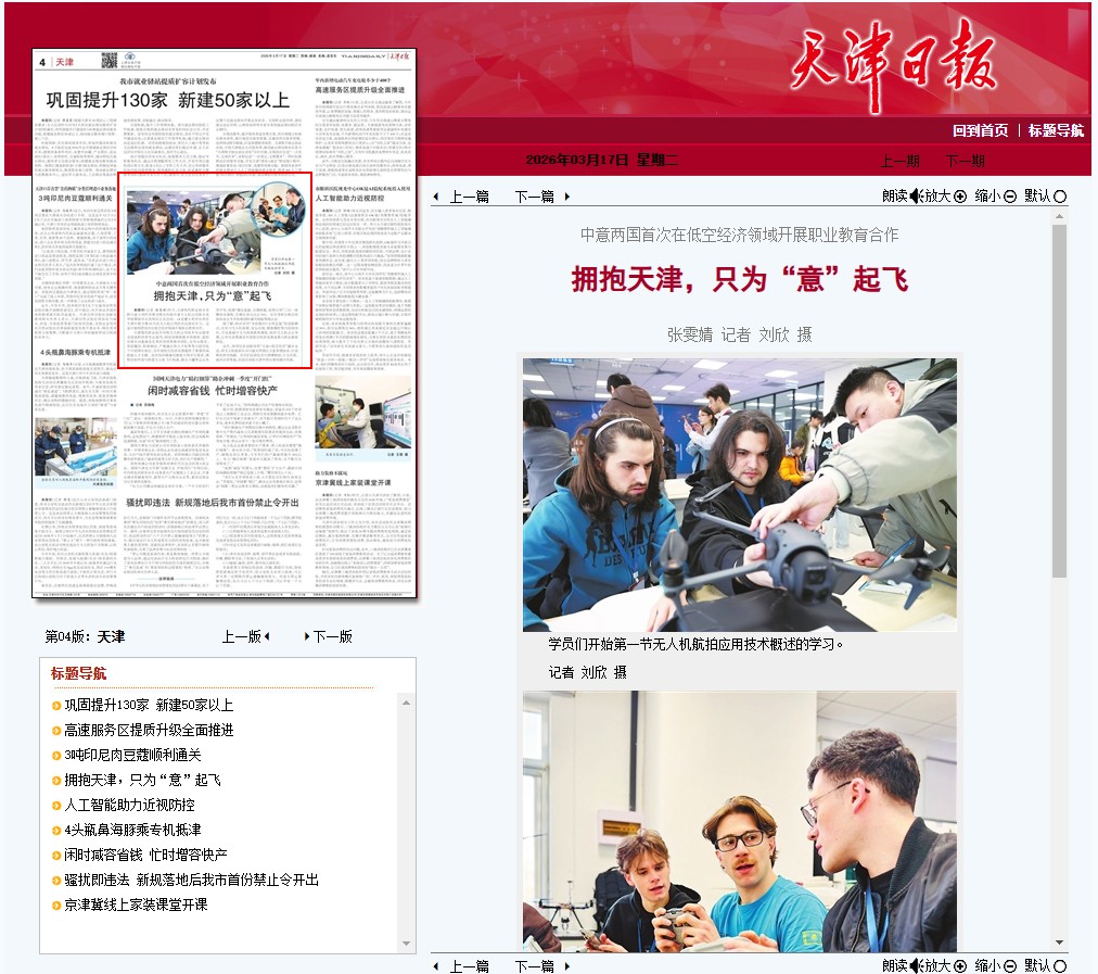本报讯(记者 张雯婧)昨天,天津现代职业技术学院与意大利约布斯学院合作的中意无人机应用技术来华短期留学示范项目正式启动。14名意大利学生将在天津开展为期15天的无人机应用技术沉浸式学习。这是中意两国首次在低空经济领域开展职业教育合作。