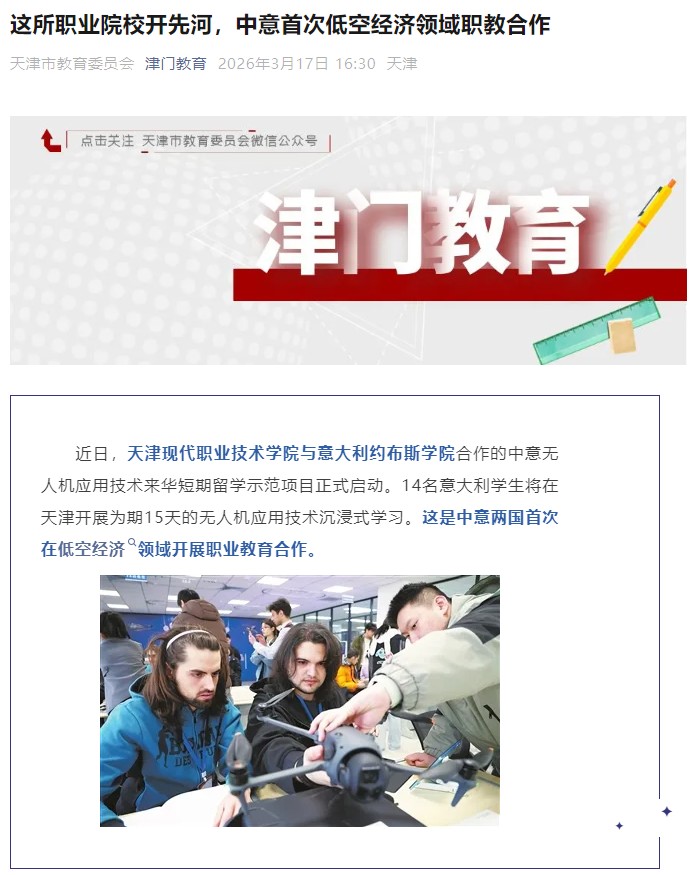 近日,天津现代职业技术学院与意大利约布斯学院合作的中意无人机应用技术来华短期留学示范项目正式启动。14名意大利学生将在天津开展为期15天的无人机应用技术沉浸式学习。这是中意两国首次在低空经济领域开展职业教育合作。